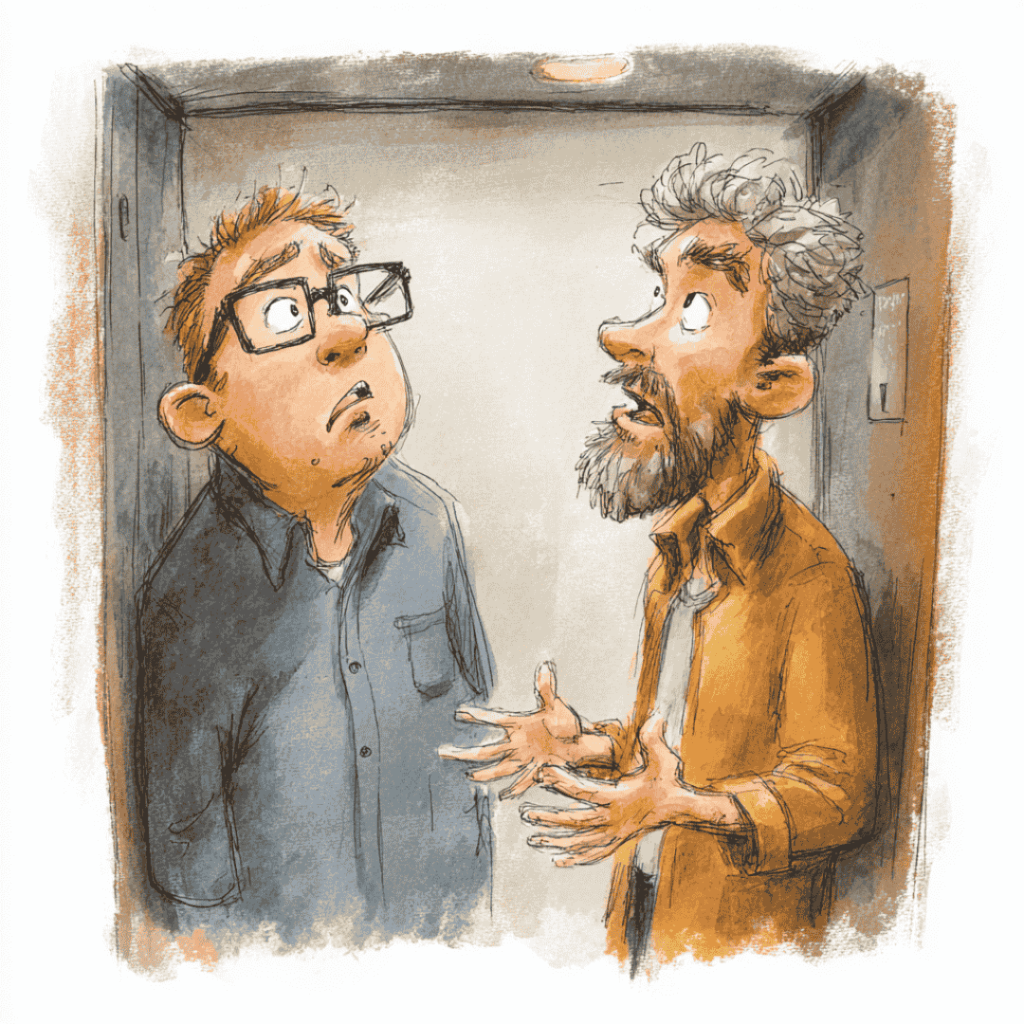 Stuck in an elevator with a conspiracy theorist, students explore absurd theories, sarcasm, and advanced vocabulary while practicing tone, disagreement, and creative improvisation in a high-level role play.